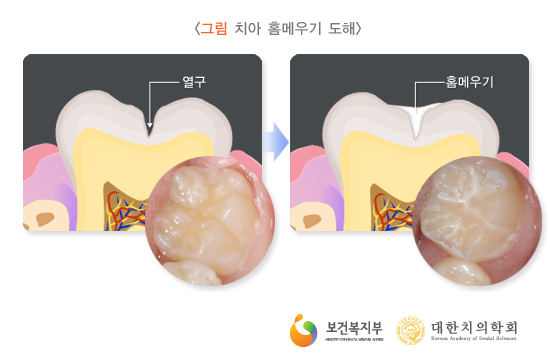 보통 충치는 어금니 중간 홈에 까만 실 같은 모양으로 시작되는 이유가 위에서 설명한 열구 때문이었습니다. 요즘엔 치아 홈메우기(실란트)라고 보험이 되는 저렴한 예방법이 있습니다. 충치 예방 효과가 90%가 넘는다고 합니다. 검색해 보시면 어릴 때 시술 받았었는데 성인이 될 때까지 유지되서 충치가 거의 없다고 하는 좋은 사례도 쉽게 찾아 볼 수 있습니다. 좀 더 자세한 건 위 그림의 출처 링크를 참조하세요.
